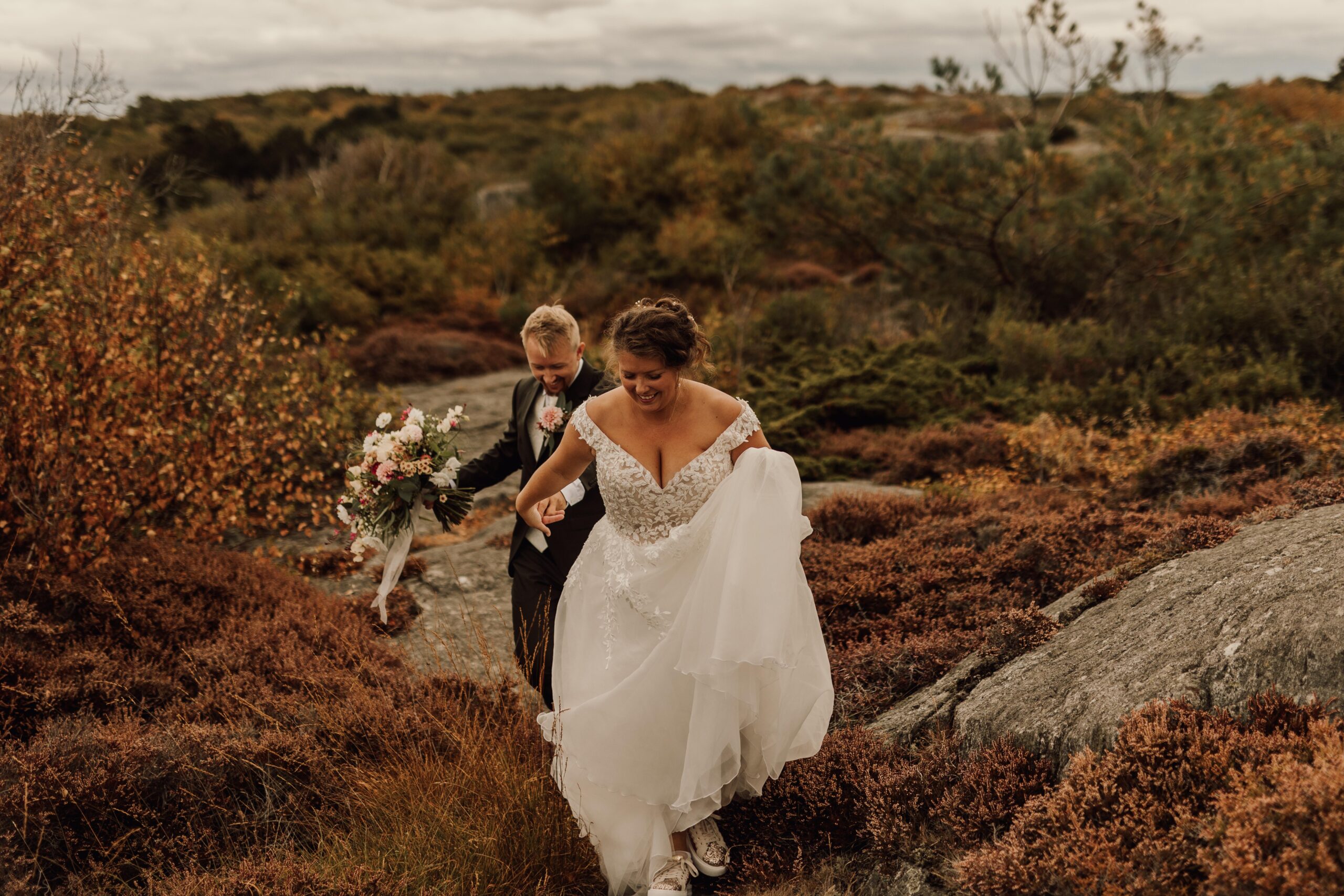 Vi tog oss vidare ut på klipporna för att fotografera deras porträtt och dra mig baklänges för vilka vyer vi fick ta del av. Grå västkustklippor med rostiga höstlöv och ett färgsprakande brudpar, lyckligare än någonsin. Vi fotade deras höstporträtt på klipporna innan vi åkte till vigseln.